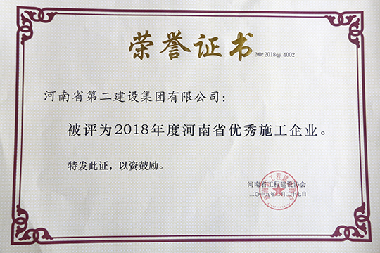 好博在线(中国)唯一官方网站荣获“2018年度河南省优秀施工企业”